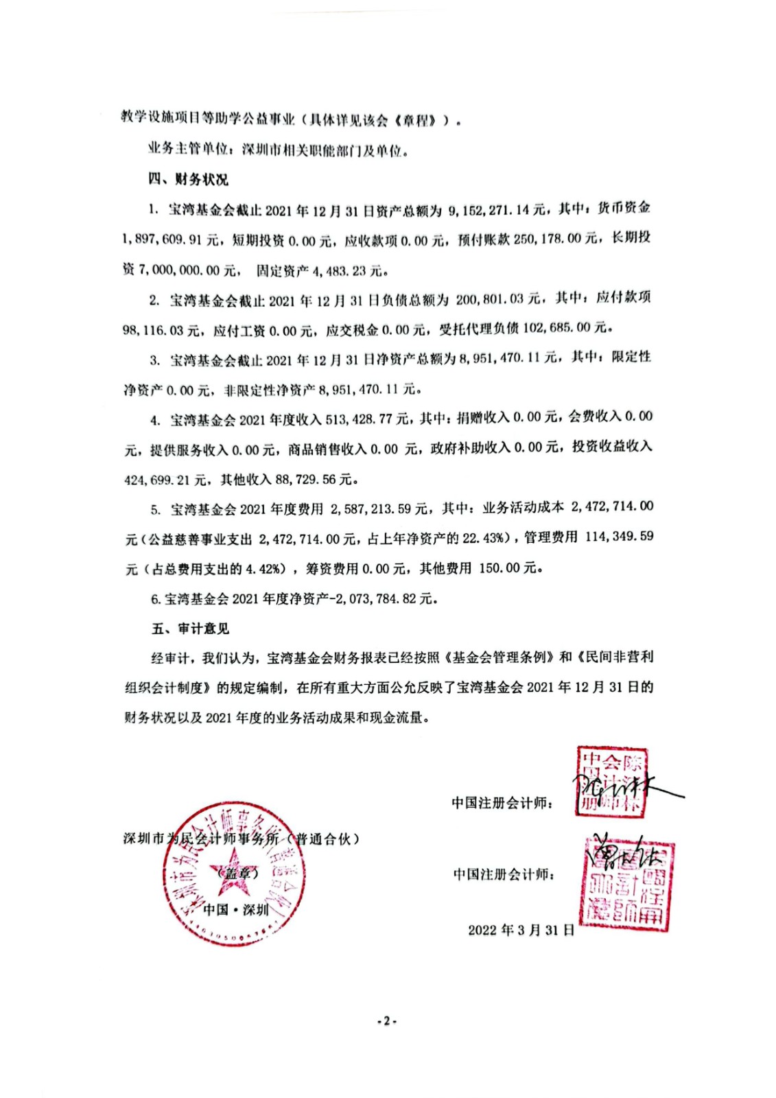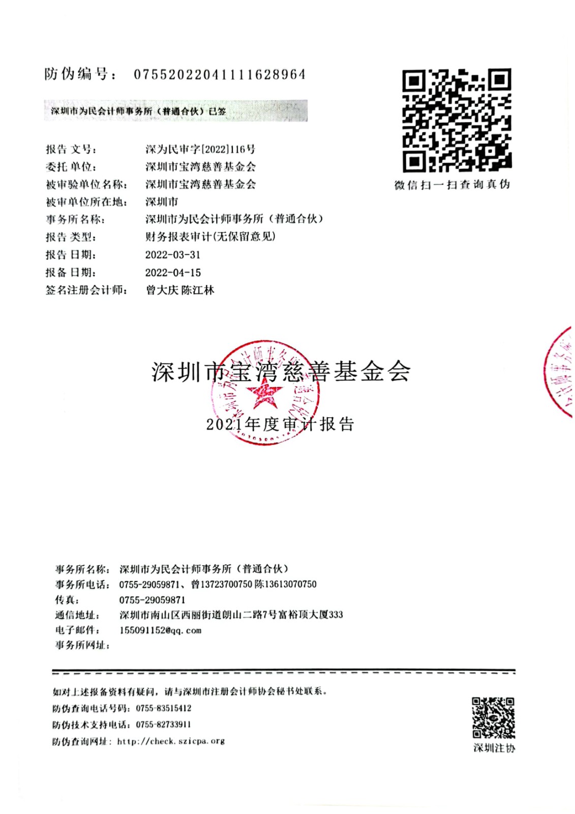 宝湾慈善基金会根据相关法律法规及《深圳市宝湾慈善基金会信息公开制度》第二章第四条、第八条“财务信息包括财务会计报告(会计报表、资产负债表、业务活动表、现金流量表、会计报表附注、财务情况说明书)、审计报告。”现向公众公开2021年度财务审计计报告: